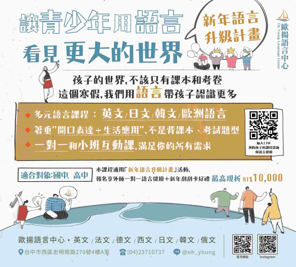 寒假學習新選擇|用語言探索世界,為新的一年培養更多可能 發佈留言 / 精選活動 / 歐揚 編編 在學校的學習生活中,國中、高中到大學生,往往已經被各種必修課程與考試填滿。 而寒假,正是一段難得可以暫時跳脫課 […] 寒假學習新選擇|用語言探索世界,為新的一年培養更多可能 閱讀全文 »