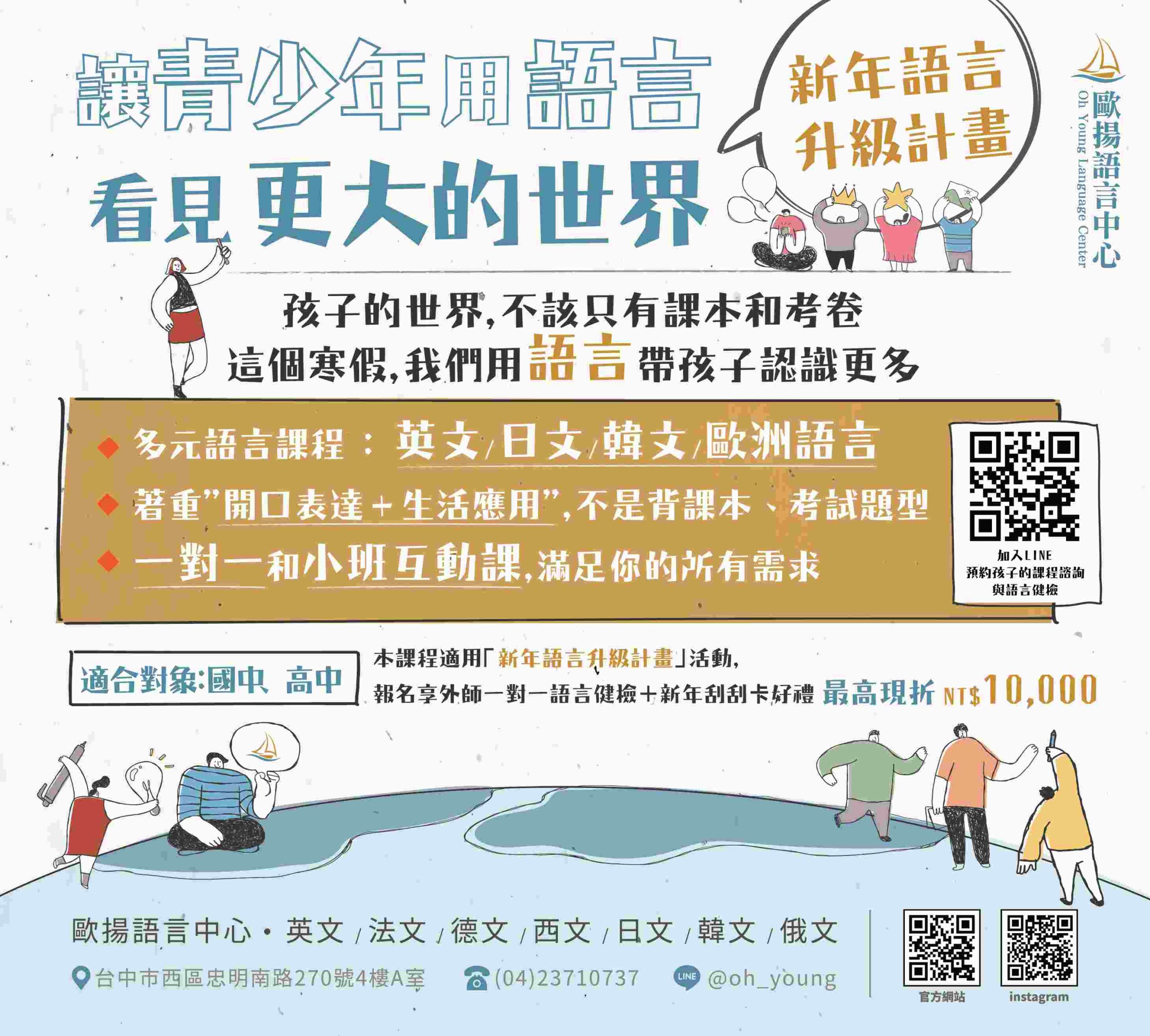 寒假期間報名語言課程,同時適用歐揚語言中心的 新年語言升級計畫優惠,內容包含: