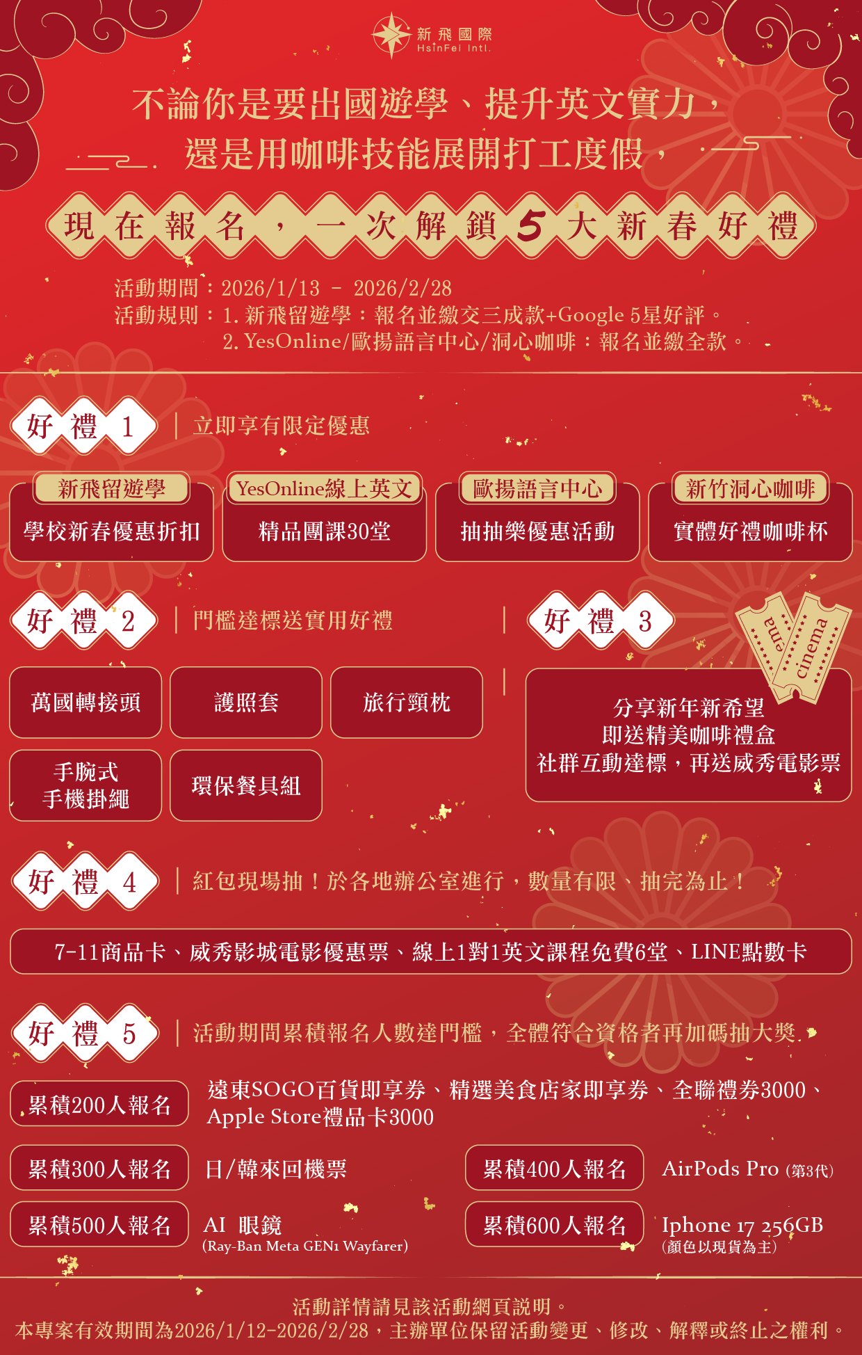 抽獎時間 : 2026/3/2 (一) 下午3:00 於臉書 新飛留遊學 · 追蹤帶你飛 粉絲專頁進行直播